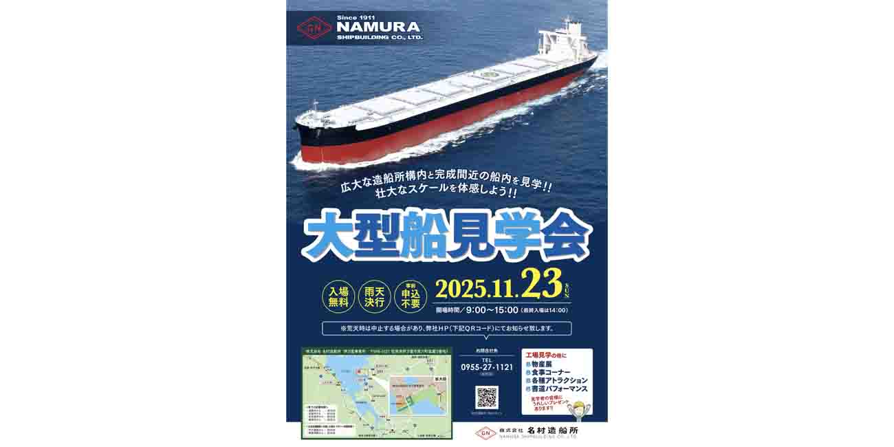 ![]() | 名村造船所 伊万里事業所、11月23日に大型船見学会を開催 完成間近の船内を見学2025年10月27日名村造船所は2025年11月23日(日)、佐賀県伊万里市の伊万里事業所において、造船所構内や建造中の大型船舶の見学ができる「大型船見学会」を開催する。 見学会は9時から15時まで行われ、最終入場は14時まで。事前申込は不 … |
