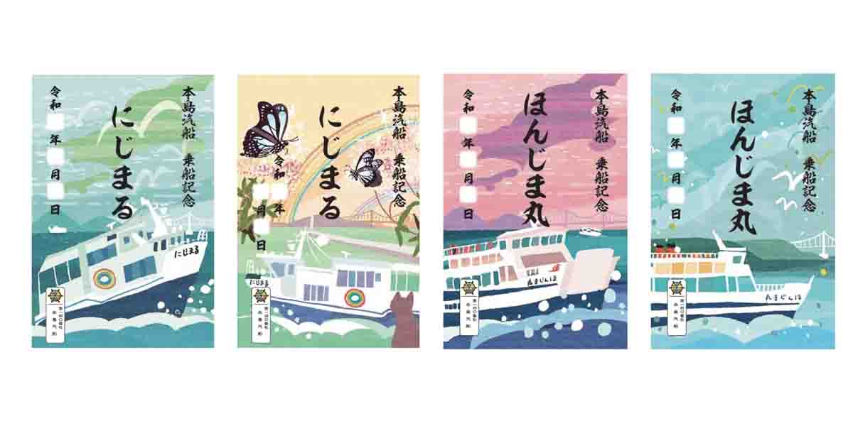 今回販売される御船印は計4種類で、旅客船「にじまる」の御船印が2種類、フェリー「ほんじま丸」の御船印も2種類用意されている。「にじまる」の御船印には、アサギマダラと虹が描かれたものと、瀬戸内海を疾走する姿を描いたものの2種類があり、「ほんじま丸」の御船印には「にじまる」や瀬戸大橋が描かれたものと、穏やかな瀬戸内海を航行する様子を描いた2種類が含まれている。