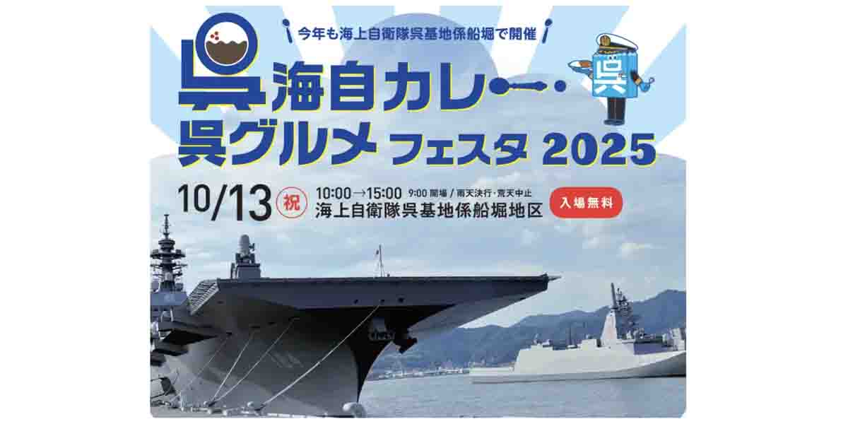 呉海自カレー・呉グルメ実行委員会事務局は2025年10月13日(月・祝)、海上自衛隊 呉基地 係船堀地区において、「呉海自カレー・呉グルメフェスタ2025」を開催する。開催時間は10時から15時まで。