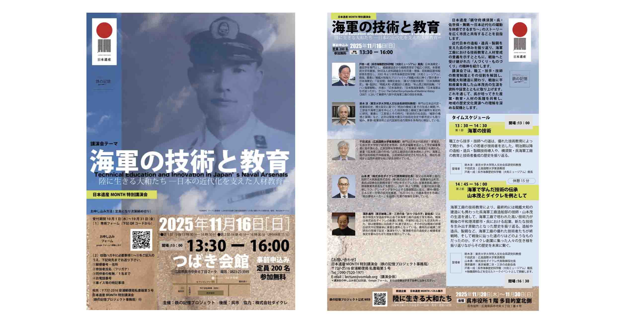 呉を中心とする瀬戸内地域をフィールドに近代日本における鉄鋼・造船・軍需産業の発展と、その背後にある地域社会・労働・戦争の記憶を学際的に探究することを目的とし「鉄の記憶プロジェクト」事務局は、2025年11月16日(日)、広島県呉市の「つばき会館」において、特別講演会「海軍の技術と教育 ―陸に生きる大和たち―日本の近代化を支えた人材教育」を開催する。