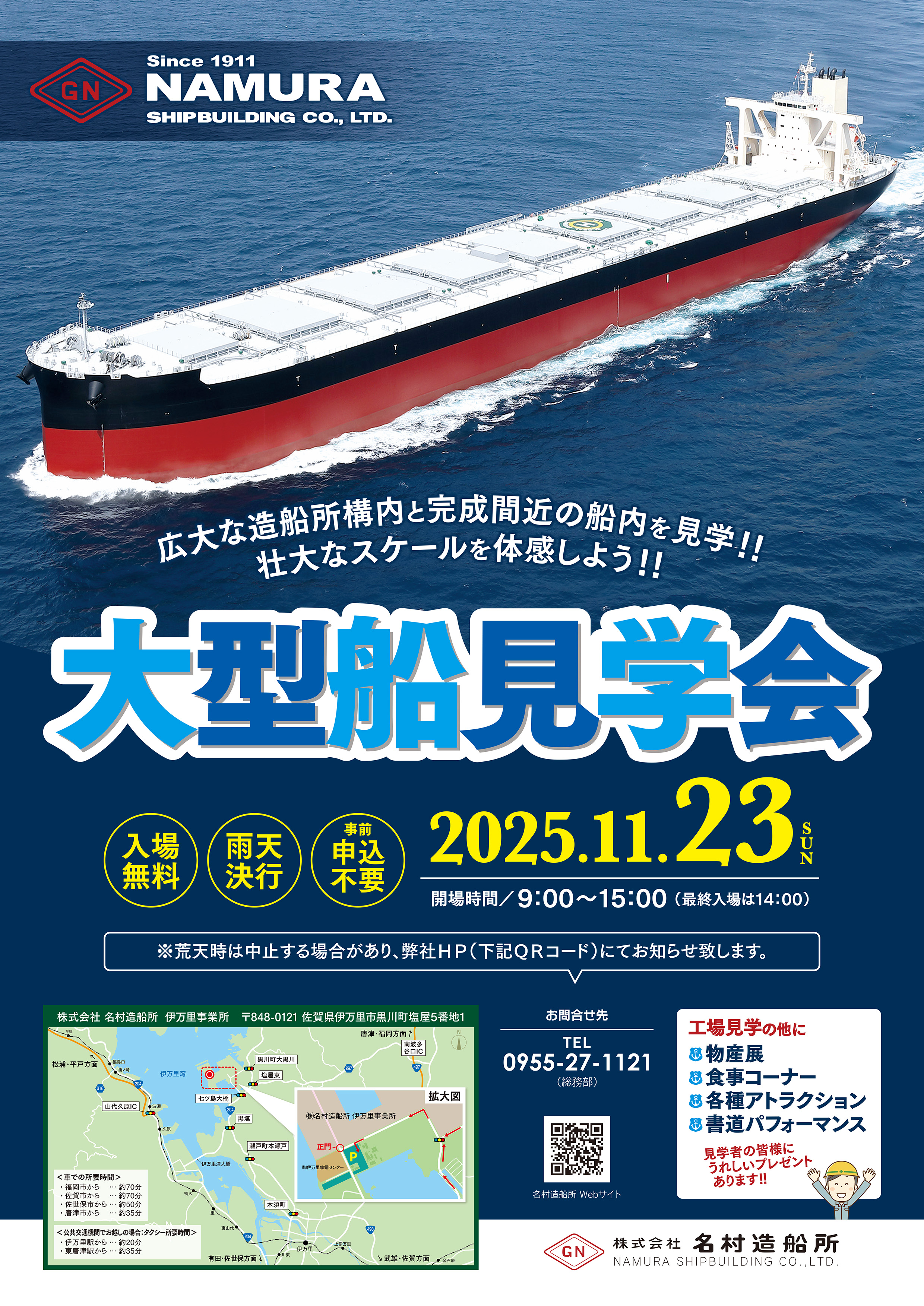 名村造船所は2025年11月23日(日)、佐賀県伊万里市の伊万里事業所において、造船所構内や建造中の大型船舶の見学ができる「大型船見学会」を開催する。