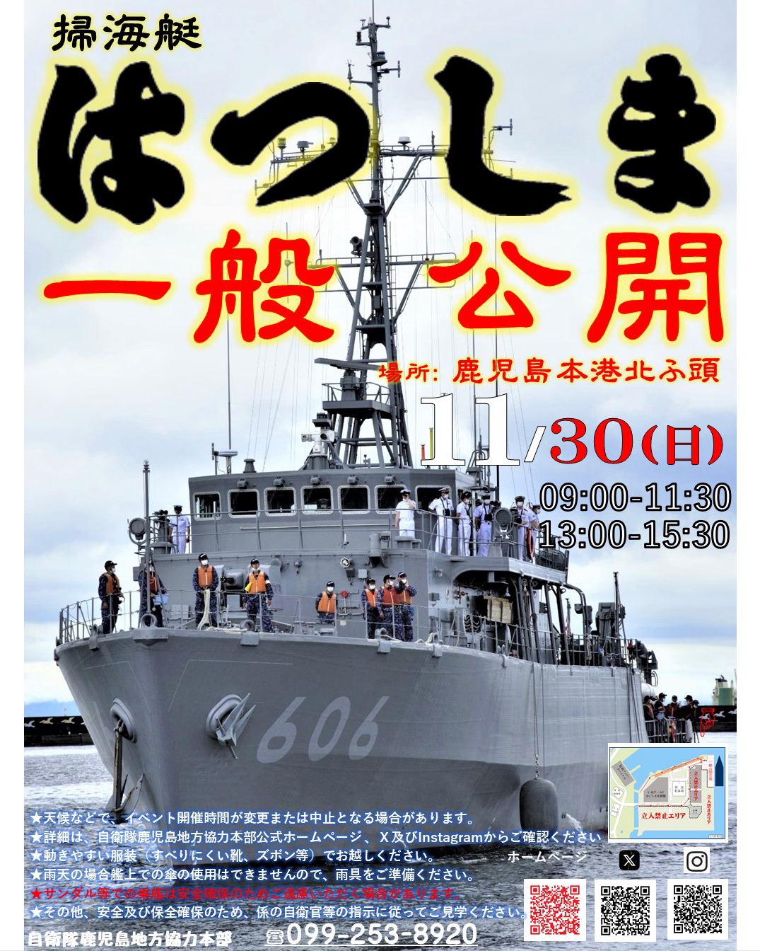自衛隊鹿児島地方協力本部と海上自衛隊は、2025年11月30日(日)、鹿児島港において、掃海艇「はつしま(MSC-606)」の一般公開を実施する。