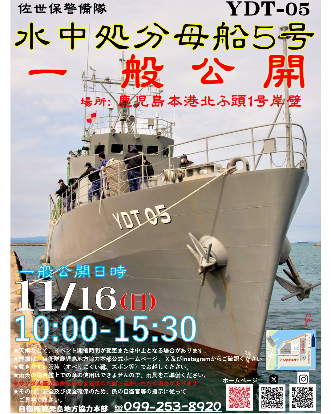 自衛隊鹿児島地方協力本部と海上自衛隊は、2025年11月16日(日)、鹿児島港において水中処分母船5号「YDT-05」の一般公開を実施する。