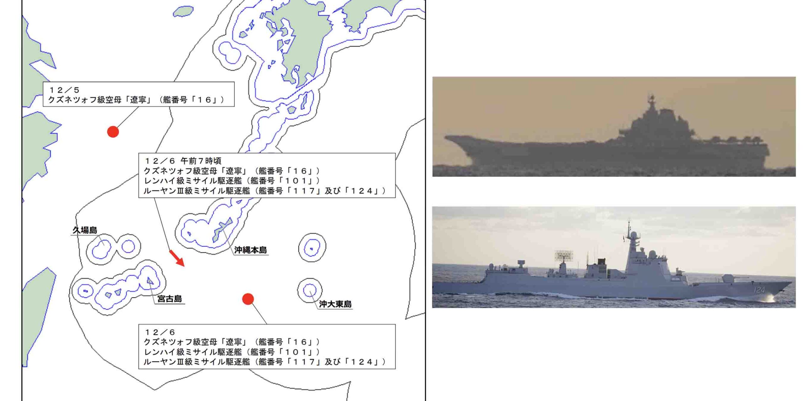 これら4隻のうち、空母「遼寧」は12月5日(金)14時頃に沖縄県の久場島の北約420kmの海域を航行することろが確認され、その後、12月6日(土)7時頃に4隻が沖縄本島と宮古島との間の海域を南東進、太平洋へ向けて航行するところが確認された。さらに、同日中に4隻が沖大東島の西約270kmの海域を航行、空母「遼寧」から艦載戦闘機や艦載ヘリが発着艦する様子が確認されている。