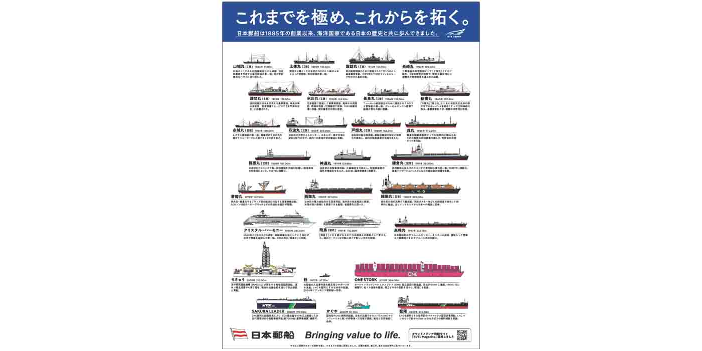 デザイン面では、同社グループの歴史を語る上で重要な27隻の船舶を厳選し、竣工年順に同一縮尺のイラストで配置。各船の外観を可能な限り忠実に再現することで、「これまでを極めてきた船舶」から「これからを拓く船舶」への技術と歴史の継承を視覚的に表現した。なお、この広告は2025年9月30日(火)の日本経済新聞紙上にも再掲載された。