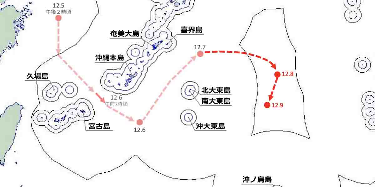 「呼倫湖」の除く3隻とレンハイ級(055型)ミサイル駆逐艦「南昌(101)」は、これまでに、東シナ海の沖縄県の久場島の北約420kmの海域から宮古海峡を通航して太平洋に進出、沖縄本島と南大東島との間の海域を北東進し、喜界島の東約190kmの海域を東進していることろが12月7日(日)に確認されていたが、今回、「遼寧」、「西寧」、「開封」、「呼倫湖」の4隻が12月8日(月)に北大東島の東約490kmの海域に、12月9日(火)に北大東島の東約450kmの海域を航行しているところが確認された。