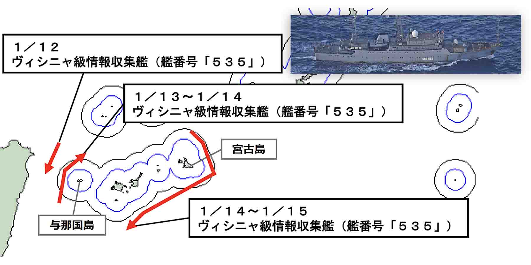 確認されたのは、ヴィシニャ級情報収集艦「カレリヤ(Карелия:SSV-535)」とみられる艦艇。同艦はまず、1月12日(月)15時頃、与那国島の北西約60kmの海域を南西進する様子が確認された後、1月13日(火)から15日(木)にかけて与那国島の南西から北にかけての接続水域内を北東進し、宮古島の北から南にかけての接続水域を含む海域を航行した後、太平洋へ向けて航行したことが確認された。
