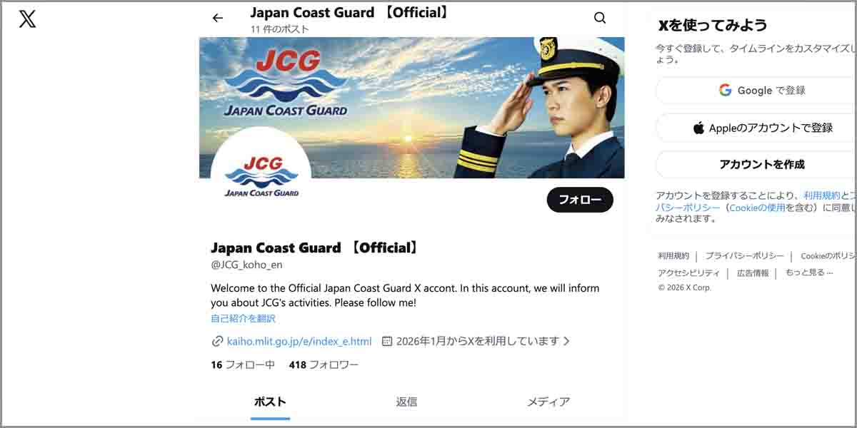 海上保安庁は、これまで以上に、世界に向けた情報発信を強化していきます。 https://t.co/NbHQkPQMmC pic.twitter.com/GzZ4ElfFxk— 海上保安庁 (@JCG_koho) January 17, 2026
