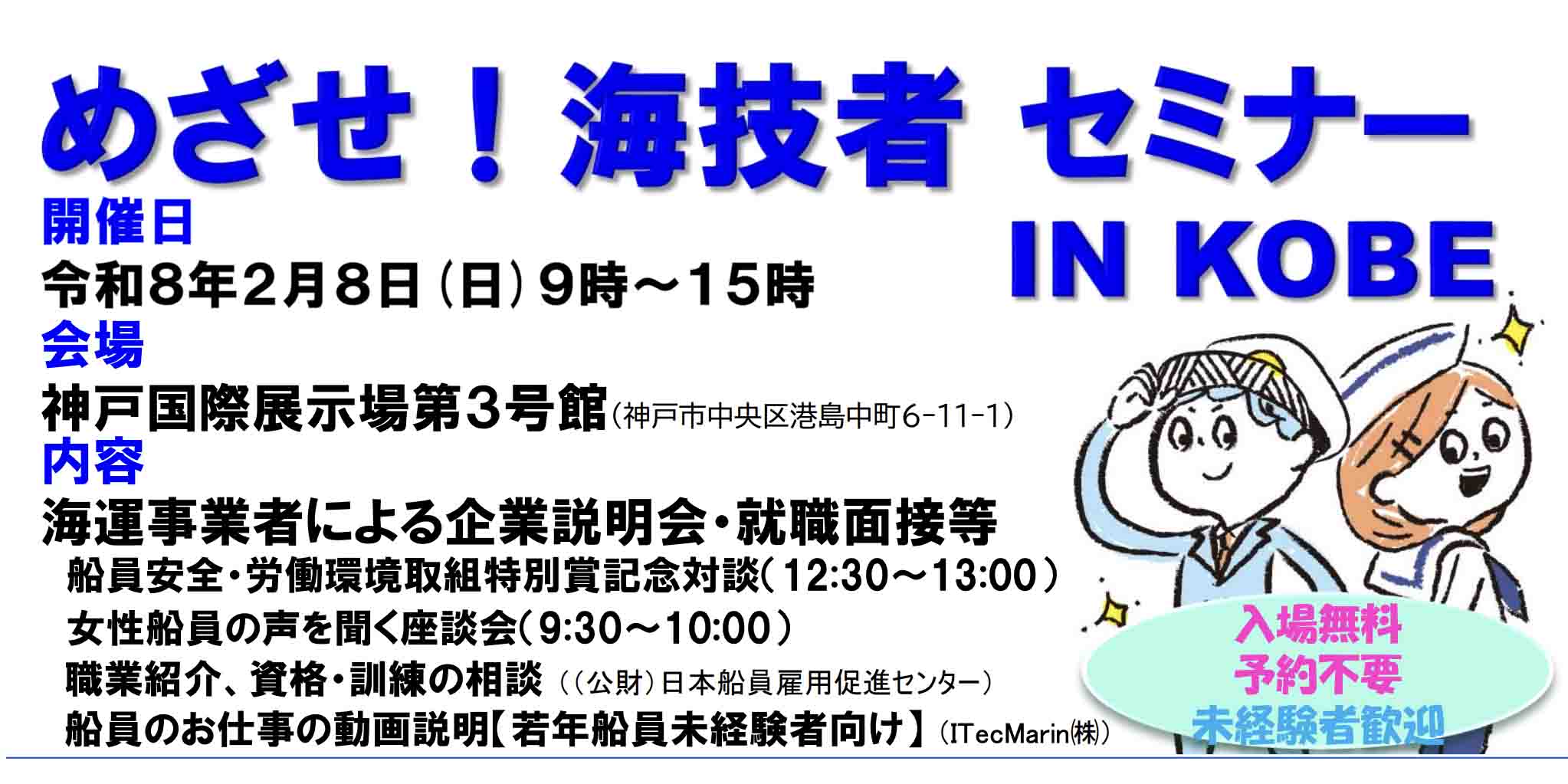 国土交通省 神戸運輸監理部は、2026年2月8日(日)の9時から15時まで、「めざせ!海技者セミナー in KOBE」を神戸市中央区の神戸国際展示場第3号館で開催する。