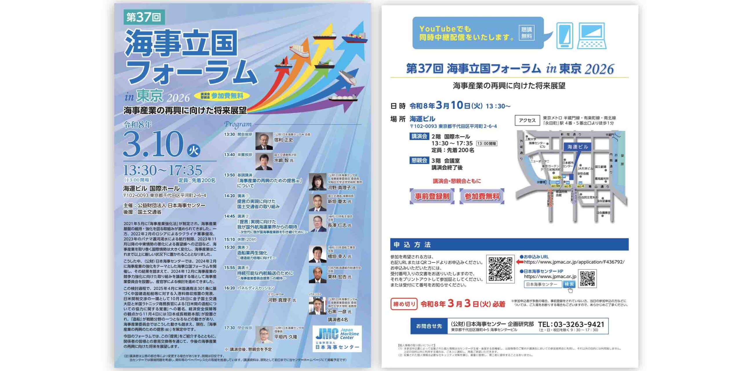 公益財団法人 日本海事センターは2026年3月10日(火)の13時30分から17時35分まで、東京都千代田区平河町の海運ビル2階「国際ホール」において「第37回海事立国フォーラム in 東京 2026『海事産業の再興に向けた将来展望』」を開催する。実地開催に加え、YouTube配信も行う。