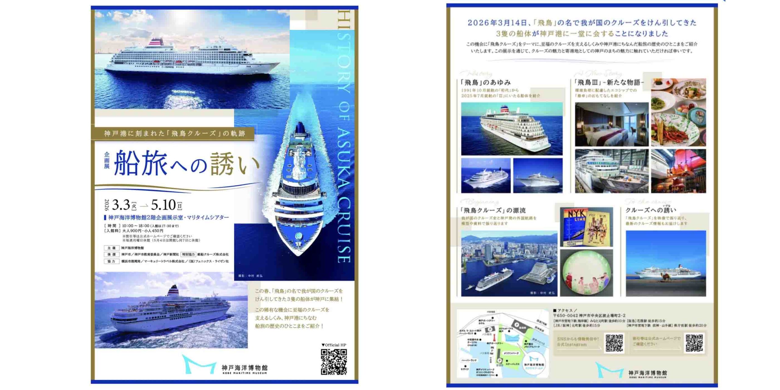 神戸海洋博物館は2026年3月3日(火)から5月10日(日)まで、企画展「船旅への誘い― 神戸港に刻まれた『飛鳥クルーズ』の軌跡―」を神戸海洋博物館2階の企画展示室とマリタイムシアターで開催する。