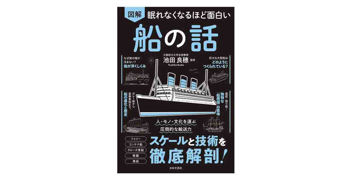 同書は、シリーズ累計400万部を突破した「眠れなくなるほど面白い 図解」シリーズの最新刊。監修は、大阪府立大学名誉教授で大阪公立大学客員教授の池田良穂氏が務める。船舶工学を専門とする池田氏の監修のもと、巨大な鉄の船が水に浮く原理、横揺れを抑える技術、航海中の衝突を避けるためのルール、船の歴史と文化、船にまつわる雑学までを取り上げる構成とされた。