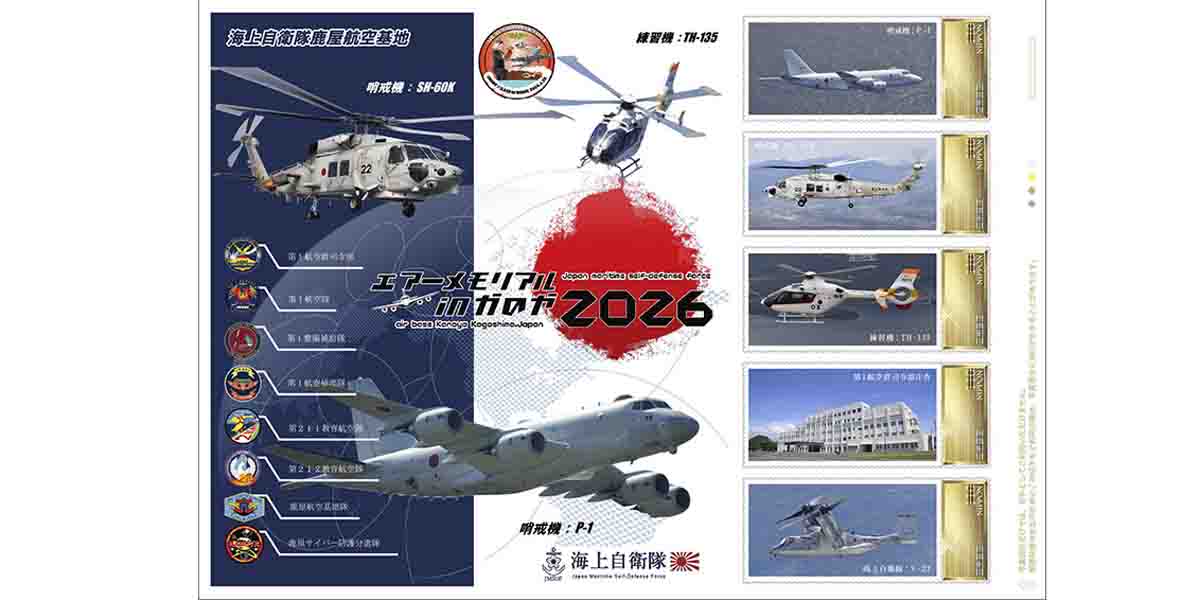 同商品は「エアーメモリアルinかのや2026」を題材に作成したもので、海上自衛隊のP-1哨戒機やSH-60K、TH-135などの航空機のほか、第1航空群司令部庁舎や陸上自衛隊のV-22の写真などが切手のデザインに採用されている。110円切手5枚とフレーム部分で構成されている。